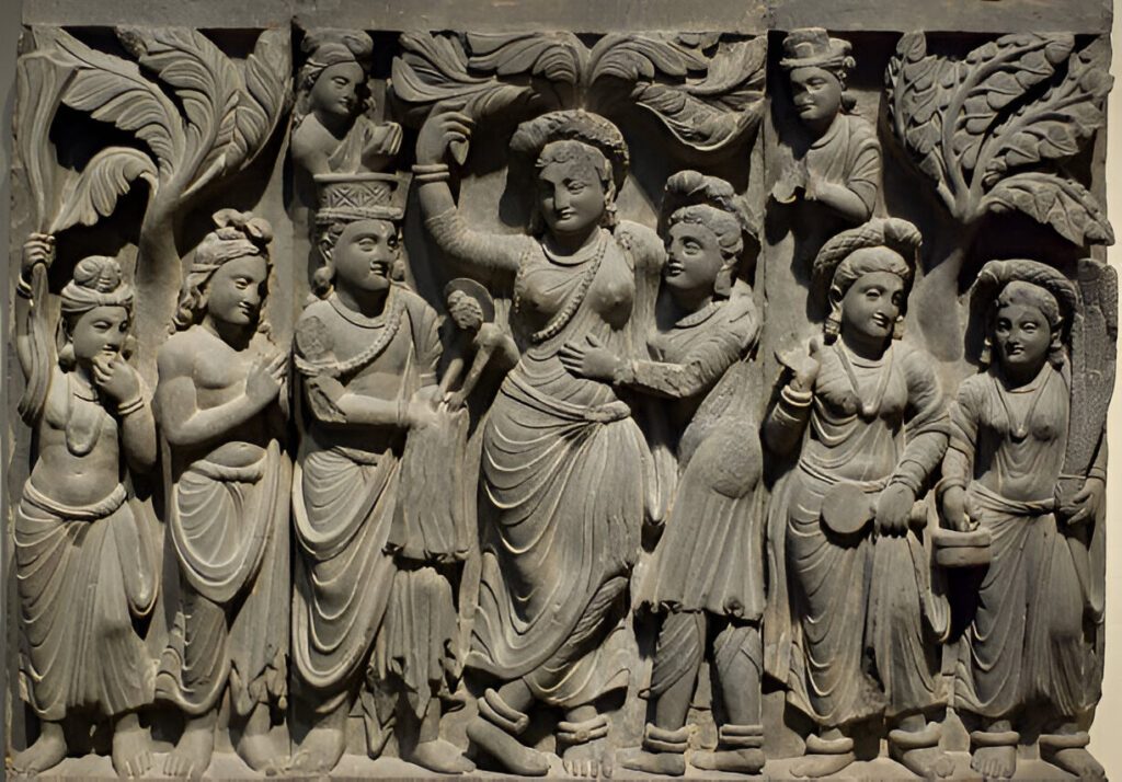 Ivories and imported glass and lacquerware attest to the cosmopolitan tastes and extensive trade that characterized the period. Stupas and monasteries were adorned with relief friezes, often carved in dark schist, showing figures in classical poses with flowing Hellenistic draperies.