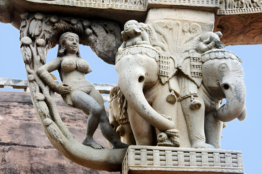 The important stupa at Sanchi shows a similar style. Important carvings on the gateways of another stupa at Sanchi date from the early Andhra period.